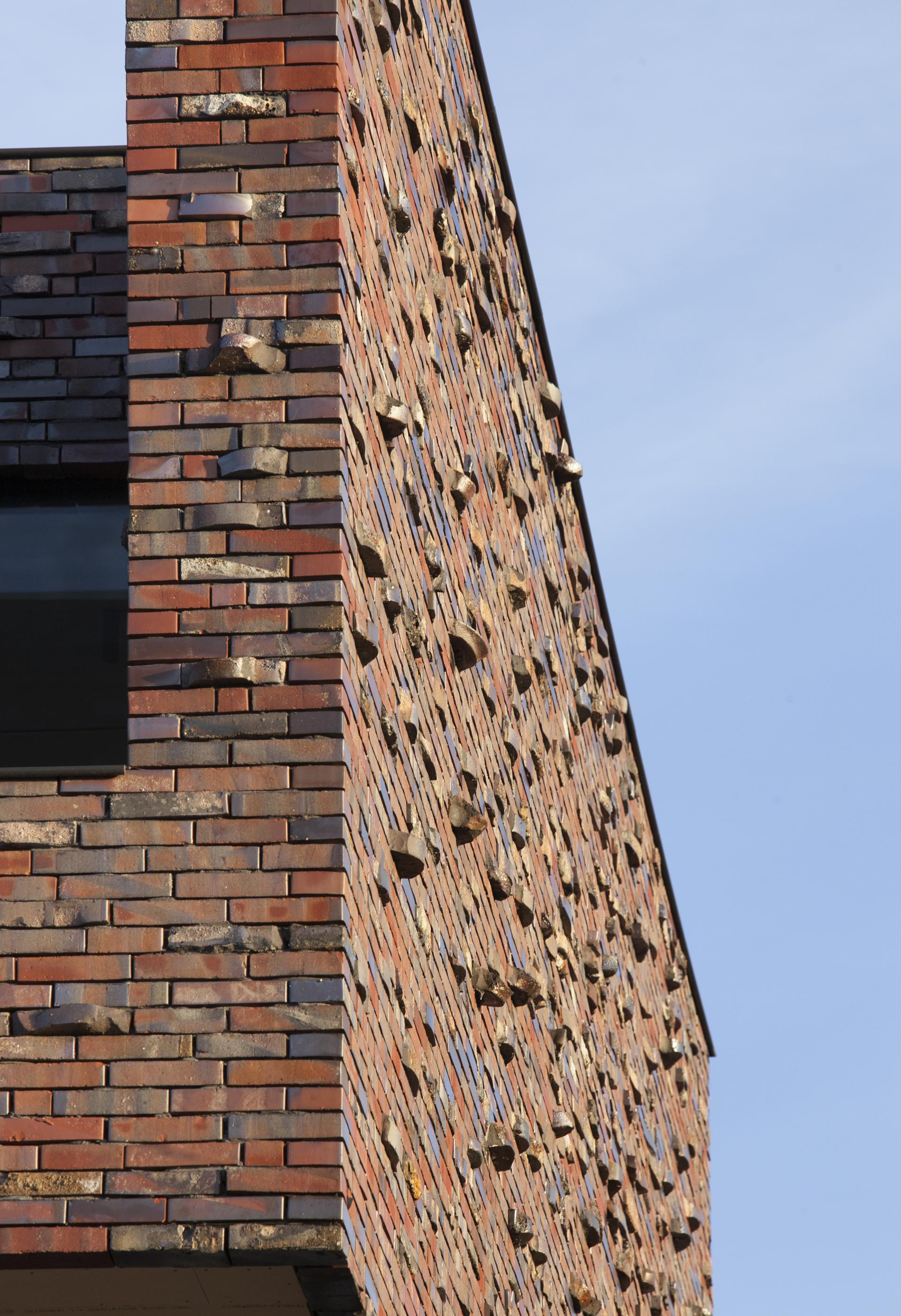 Das Objekt mit der futuristischen Gebäudeform wurde mit der Gillrath Klinker-Sortierung Ringofenklinker DF STP Jaco GR 201 mit hohem Retroanteil verblendet. Beim Brennprozess wird die Sortierung so hoch gebrannt, dass die Steine im Prinzip zerlaufen. Die Klinker werden über den Sinterungspunkt gebrannt. Das heißt, die Steine werden bei 1120-1140 Grad im Ringofen gebrannt und sintern über einen gewissen Zeitraum. Dabei zerlaufen sie und verlieren ihre Ursprungsform. Sie sind so verformt, dass diese wie ein 3D-Effekt aus der Wand herausstechen. Diese Steine nennen wir Retros. Die Bauherren favorisierten einen hohen Retroanteil, die an dem futuristischen Objekt gut verteilt zur Geltung kommen.